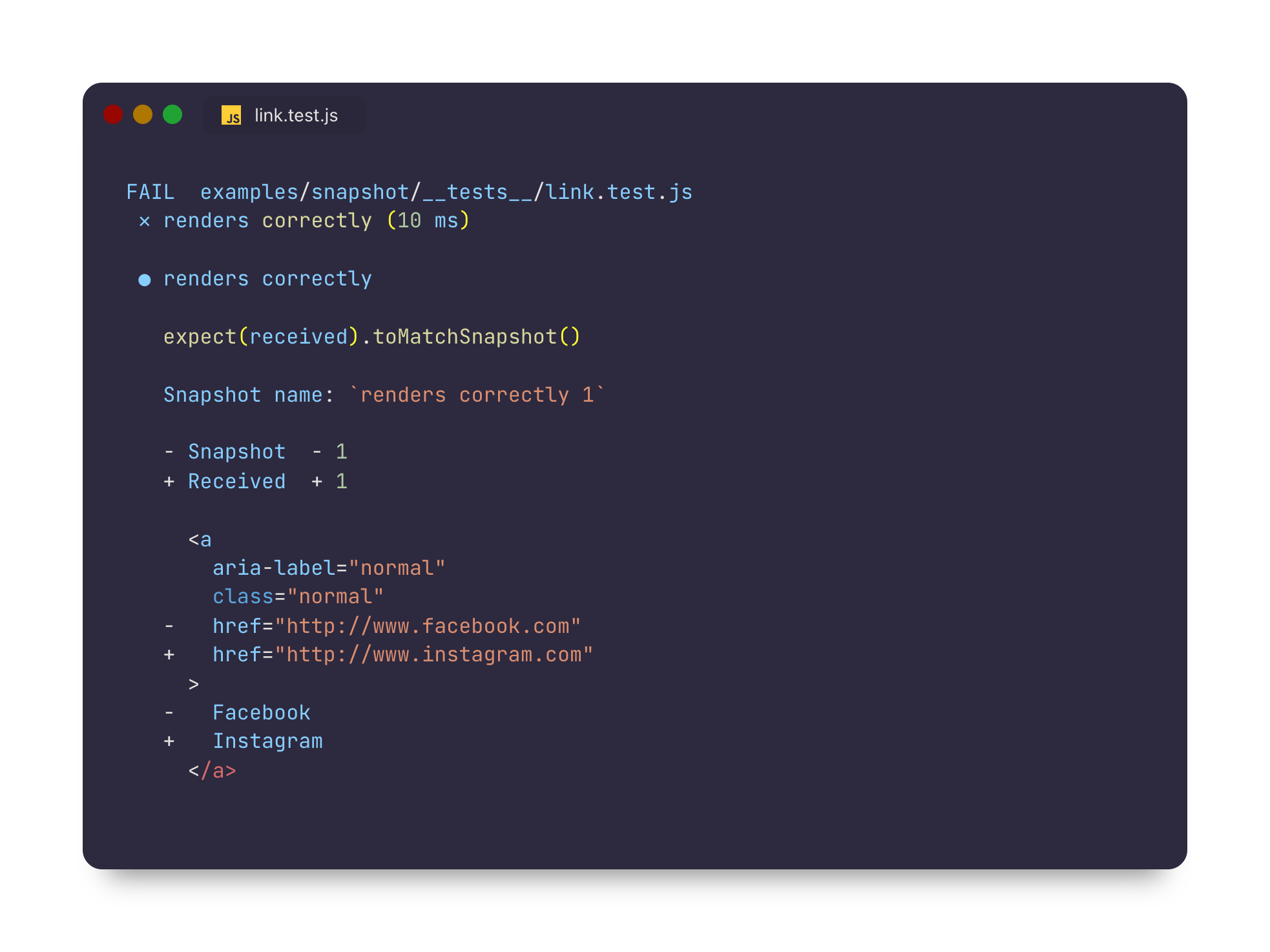 The snapshot artifact should be committed alongside code changes, and reviewed as part of your code review process. Jest uses pretty-format to make snapshots human-readable during code review. On subsequent test runs, Jest will compare the rendered output with the previous snapshot. If they match, the test will pass. If they don't match, either the test runner found a bug in your code (in the <Link> component in this case) that should be fixed, or the implementation has changed and the snapshot needs to be updated.