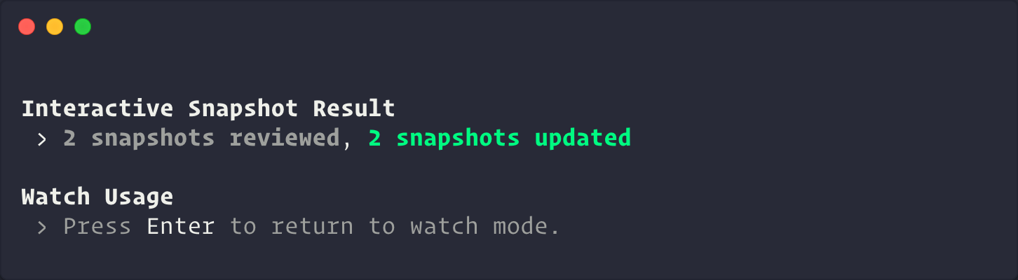 That's all there is to it! You can even update the snapshots with --updateSnapshot or using the u key in --watch mode.